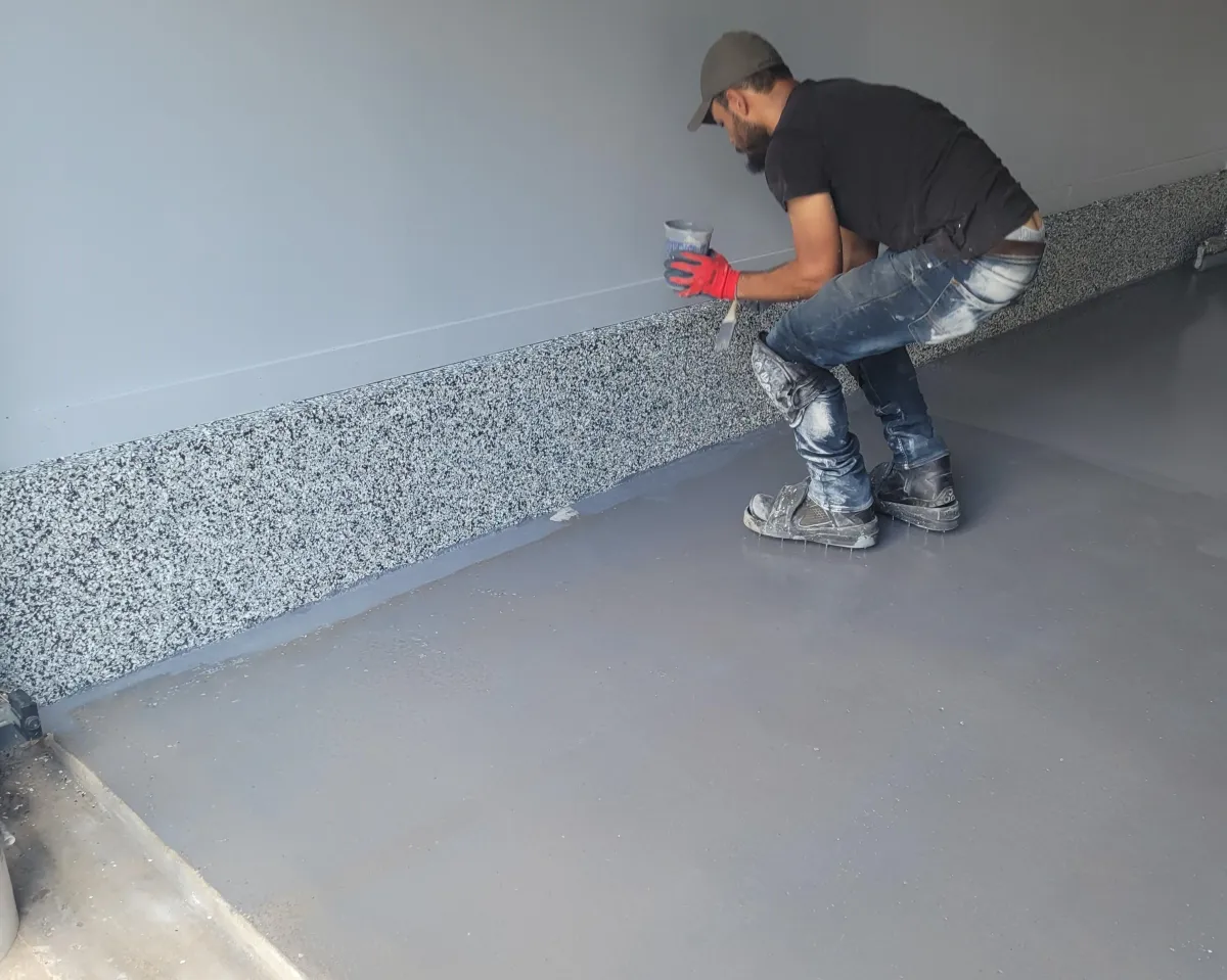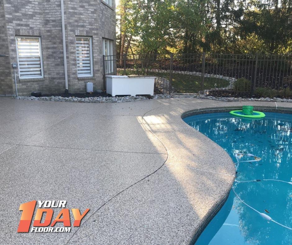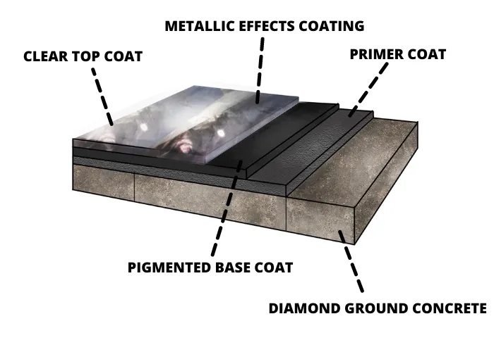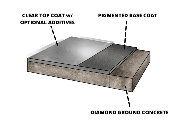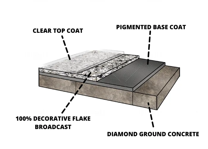We apply 100% solid epoxy base coat system. This coating is flexible after it dries. Once poured, it will seep into the pores of the concrete's surface, creating roots when fully cured. The best option on the market