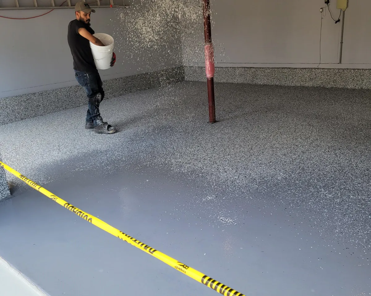 Polymer-based flakes are then broadcast across the floor using 3x as much flakes as required to ensure all areas are covered generously and evenly.